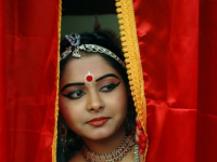 South Indian dancer prepare themselves before a stage show at a dance festival in Kolkata
