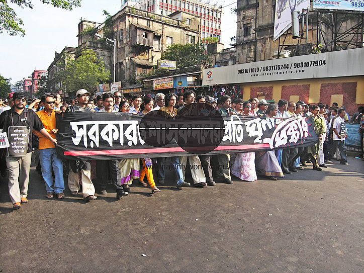A rally against the brutality in Nandigram, at a street, in Kolkata, India. November 14, 2007. In 2007 the West Bengal government decided to allow Salim Group, an Indonesian conglomerate, to set up a chemical hub at Nandigram under the Special Economic Zone, SEZ, policy. This led to resistance by the villagers resulting in clashes with the police that left 14 dead and accusation of police brutality. Source: www.wikipedia.com