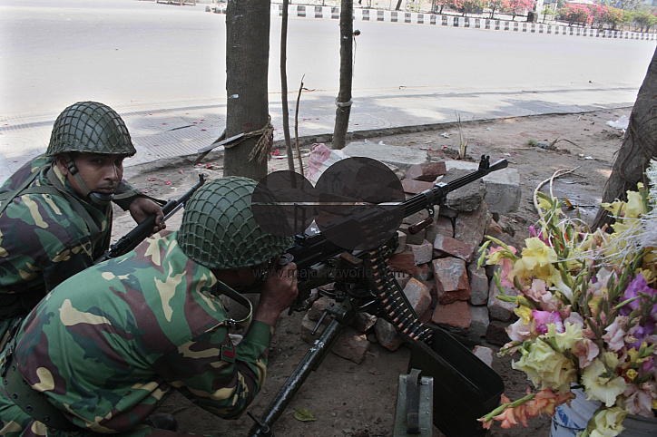 A mutiny by Bangladesh Rifles, BDR, soldiers broke out in their Headquarter in Pilkhana, in the morning of 25th February, making the area into almost a war zone. Several thousand shots were fired from machineguns, killing around 60 army officers, at the BDR Pilkhana Headquarters and several civilians near the area. Military personnel took strategic position on the roads to tackle the situation. Dhaka, Bangladesh. February 25, 2009.