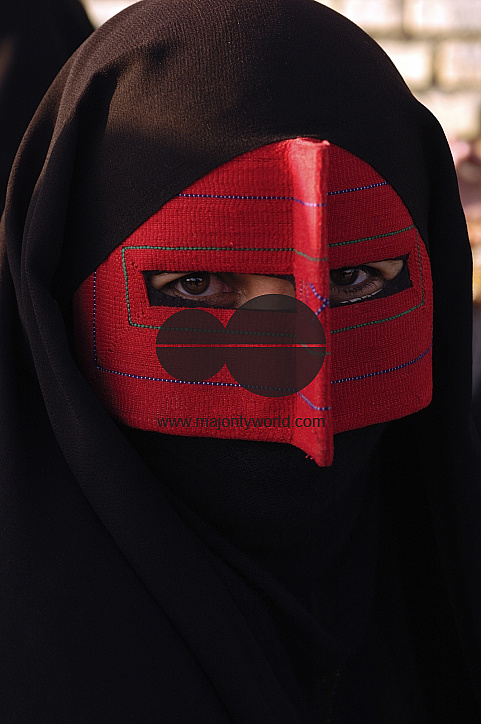 A woman in a traditional mask known as Nakab in the village Kohestak , 45 km away from the South of Menab city in Hormogan Province. The mask is usually worn by rural women in Southern Iran. A little difference in colour or design of the mask can have significant meanings. For instance, red masks are usually worn by married women and black masks are worn by unmarried women or widow. Again, red masks with black rectangular border around eyes are worn during sad events like funerals, etc. Quality of mask and use of gold in mask signify higher status of women and their families. Iran. January 25, 2004.