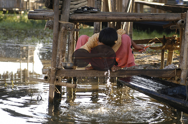 Using lake-water just under her house, Yin Yin Win (11 years old) brushes her teeth before going to school in Heya Ywa Ma village on Lake Inle in Shan State. Myanmar..The family survives on income from Tofu making.