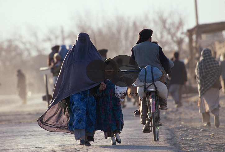A woman completely covered in a typical blue coloured Afghani 'burqa', walks on a busy street, holding a childs hands in Dast-e-Barchi neighbourhood of Kabul. Afghanistan.