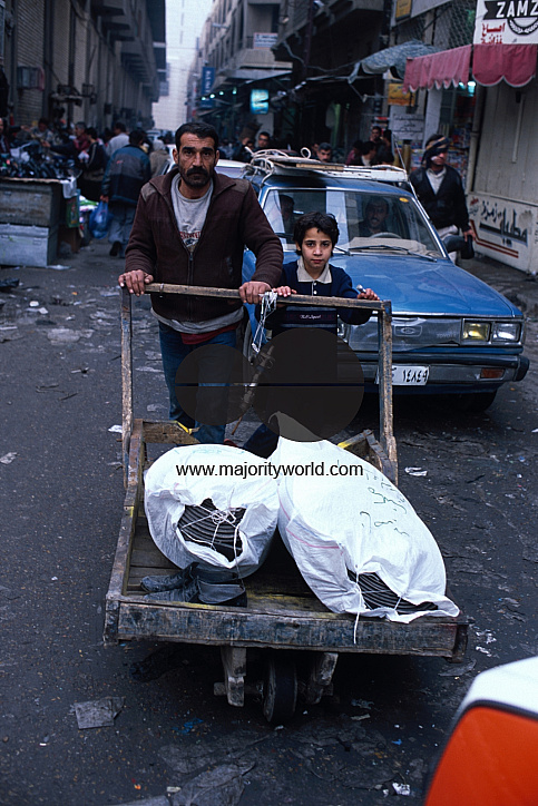 A young boy child helps her father to push a loaded cart through Al Shorja Market Place in Baghdad..Additional Info:.Until January 2003, the situation of children and women in Iraq remains critical. One million children under five in southern and central Iraq continue to suffer from chronic malnutrition. Some 60 per cent of the entire population depend on monthly Government food rations, making them extremely vulnerable to any disruption in these supplies in the event of conflict. Widespread poverty and crumbling infrastructure, the result of years of conflict and 12 years of international economic sanctions, have affected all sectors, including massive deterioration of the country's water and sanitation systems.