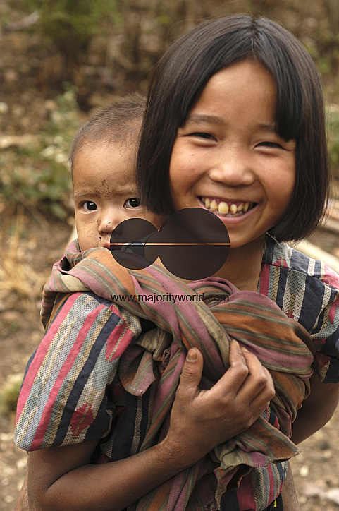 Mahlu Mar (12 years old), a Makang (ethnic group) child, carries her younger sibling on her back using a piece of fabric locally called Saung, in Kan Thar Yone village in Southern Chin state in Myanmar.