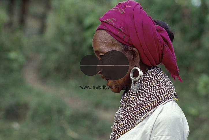 Portrait of an old woman of Tripura tribe in traditional Tripura costume. Ali Kadam. Bandarban District. Chittagong Hill Tracts, Bangladesh.