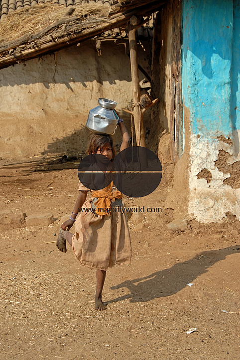 India: Girls and women bear the burden of fetching water and providing food on the table. From a small age they are taught to walk sometimes 3 to 4 kilometers to the village well or stream to fetch water. Seen here is a girl returning from this chore. 10t