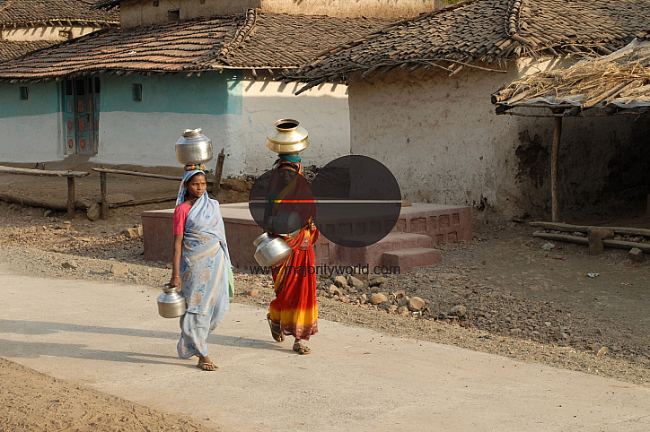 India: Women carry pots of various sizes to go and fetch water from the local village well or stream. Shot in a village near Nagpur. 07-Mar-07. .