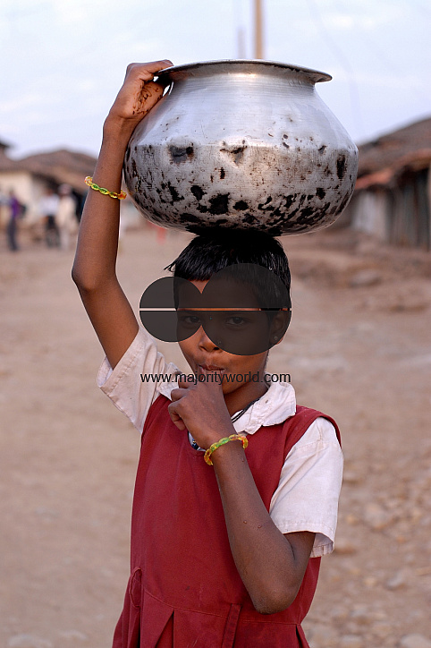 India: Finger in mouth - this was exactly how this little girl was walking down the rural street carrying water for her family. Image shot in village near Nagpur, Maharashtra. January 29, 2007.