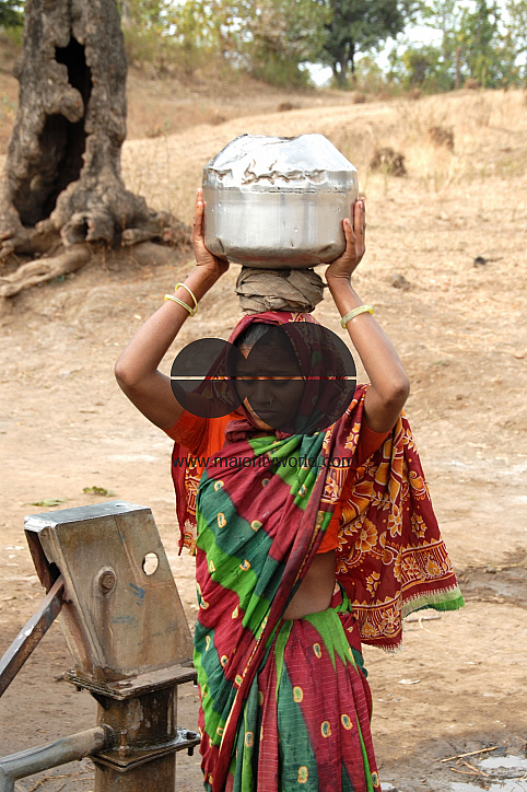 India: This young lady had placed one vessle of water on her head and is preparing for the multiple others that will go on top in which she will carry the water from the local village hand pump in a village near Nagpur, Maharashtra. January 29, 2007.