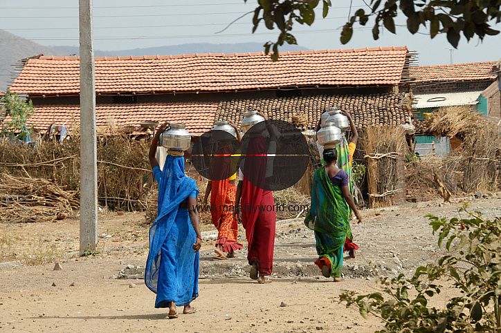 India: Group of women returning to their village after filling water from the the community well which is fitted with a hand pump. The women typically carry the water in vessels balanced on their heads. This image was taken in a village near Nagpur, Maha