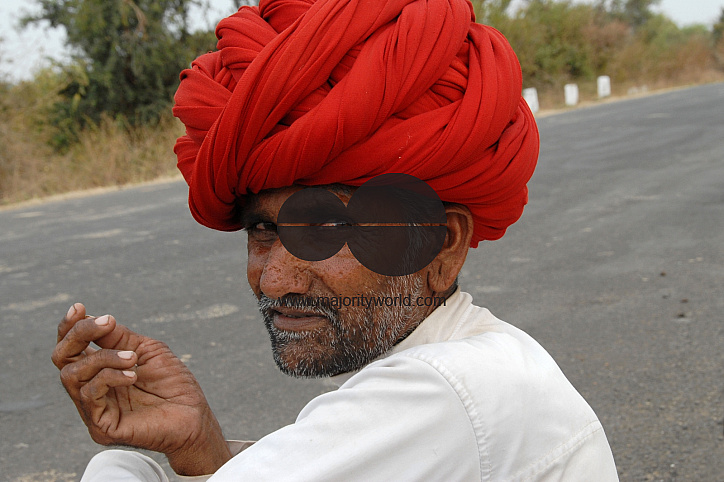 India:This man from Rajasthan dressed in their tradition attire was travelling with his family and they were waiting for a ride in a village near Nagpur, Maharashtra. January 30, 2007.