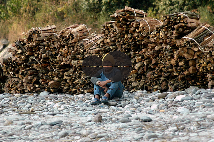 A boy sits along a river bank at Teesta river in front of a stack of firewood for selling, 16km from Kalimpong, India. January 11, 2006.