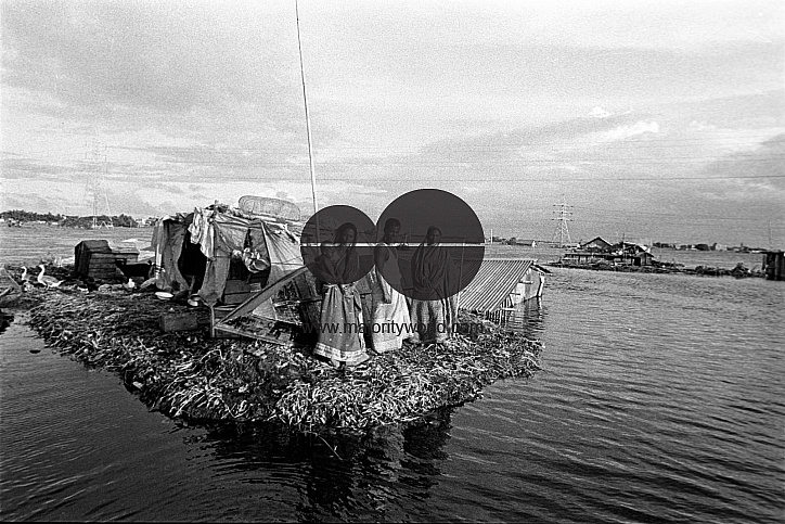 A family from flood affected area living on a raft made of water hyacinth. Many people become homeless every year in low-lying areas that are prone to flood. Keraniganj, Dhaka, Bangladesh. 2004.