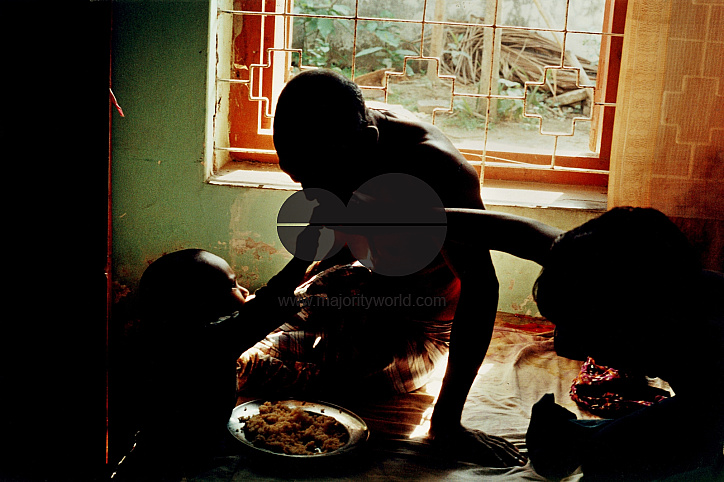 Abdul Barek Mia is sick. When he had his second stroke the right side of his body was paralyzed from hand to leg. He became dependent on others for all things like eating, bathing, etc. His younger son and grandson try to feed him. Everyone is dependent in two stages of life; after birth & at old age. Bangladesh. 2001.