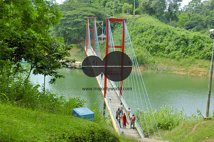 A Hanging bridge on Kaptai Lake in Rangamati. Kaptai Lake is a man-made lake in south-eastern Bangladesh. It is located in the Rangamati District of Chittagong Division. The lake was created as a result of building the Kaptai Dam on the Karnaphuli River, as part of the Karnaphuli Hydro-electric project. Rangamati, Chittagong, Bangladesh. August 18, 2006 (Source Wikipedia)..