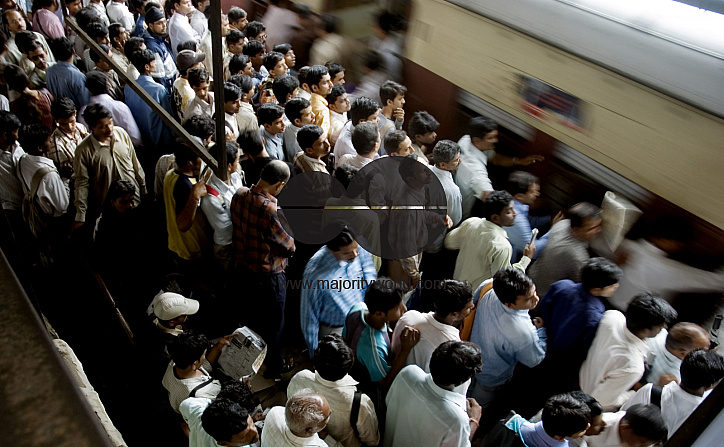 Commuters wait as a train approaches at a railway station. An estimated 6.4 million commuters living in the far-flung suburbs use the local trains daily to travel to their destinations. June 5, 2007.