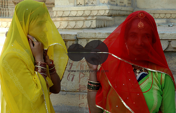 Portrait of two Rajasthani women at Jaisalmir, Rajasthan, India. May 2, 2007. Rajasthani women are known for their simplicity, beauty and valor all over the world. They have been renowned for their grace and beauty. The women of Rajasthan show a distinct preference for bright costumes. From the simple village women or tribal to queens, the preferred colors are bright red, dazzling yellow, lively green or brilliant orange, highlighted by a lavish use of sparkling gold and silver zari or gota. Tribal and nomadic women are known for their love for silver jewellery. The ornaments follow age-old designs typical of a particular tribe. In daily use the ladies wear normal ornaments of neck, hand, nose and ear but on special occasions and social functions women wear all the ornaments of different parts of the body to look beautiful and attractive.