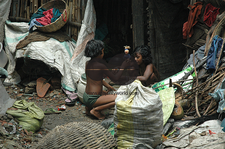 Children playing at a Road side slum of Kolkata city. Most of the transient roadside settlements and slums have been formed by refugees from East Pakistan. Infiltration in the city also takes place frequently from the villages of 24 Paraganas. The slum dwellers are mostly engaged as domestic servants, sweepers, daily laborers, small traders etc. India. July 17, 2005.