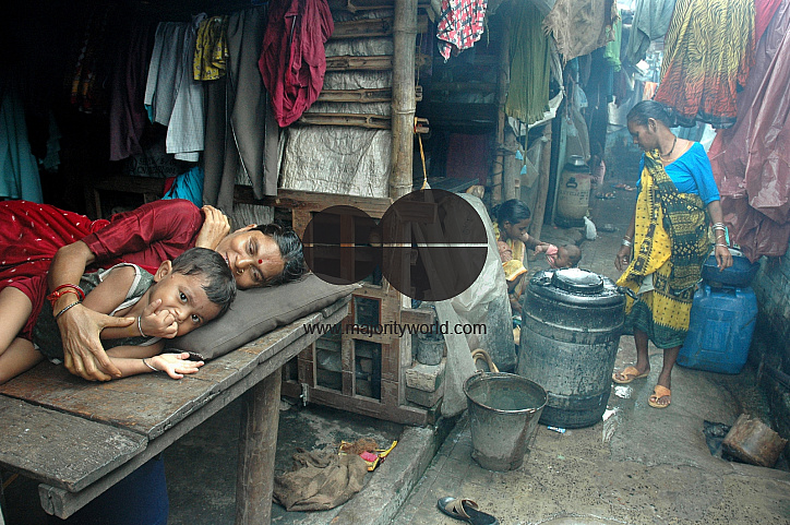 Life at a Road side slum of Kolkata city. Most of the transient roadside settlements and slums have been formed by refugees from East Pakistan. Infiltration in the city also takes place frequently from the villages of 24 Paraganas. The slum dwellers are mostly engaged as domestic servants, sweepers, daily laborers, small traders etc. India. July 19, 2005.