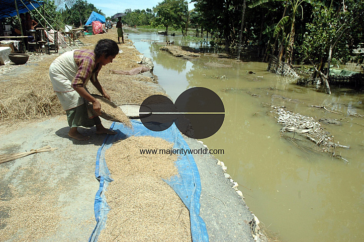 Flood victims trying to dry up their damaged paddy crops on their temporary shelters on National Highway 52, in Bordoloni area in Dhemaji district, where the villagers are staying. More than 120 villages and about fifty thousand families have been affected with the 2nd phase of flash flood that started again from Sunday night, caused by the heavy rainfall in Arunachal Pradesh. Dhemaji, the eastern most district of Assam bordering Arunachal Pradesh is totally cut off from the rest of India since 12th July 2007. More than 10 thousand affected people are staying in relief camps. India. July 16, 2007.