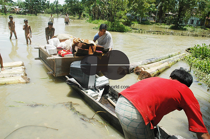 Household items being shifted to a safer place in the flood affected Bhakatgaon in Dhemaji district of Assam, 500 km away from Guwahati. on Sunday, July 15, 2007. A total of 120 villages and more than forty thousand families have been affected in the flash flood caused by the heavy rainfall Arunachal Pradesh. The flood water also washed away few portion of National Highway No. 52 as a result of Dhemaji district and few parts of Arunachal Pradesh is totally cut off with rest of the country since July 12th. India.