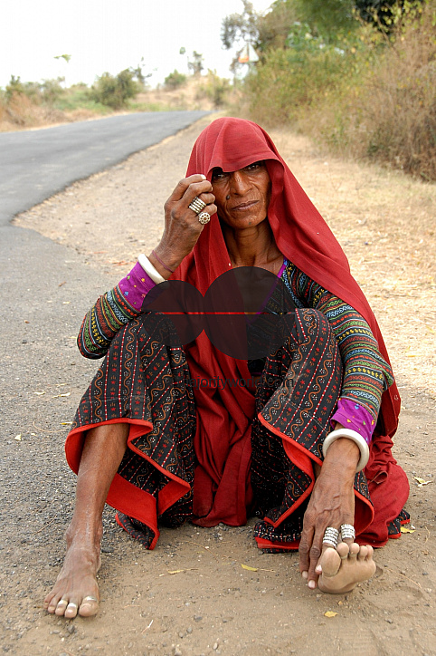 A woman from Rajasthan, dressed traditionally, and was travelling with her family, sitting by the road and waiting for a ride in a village near Nagpur, Maharashtra. January, 2007.