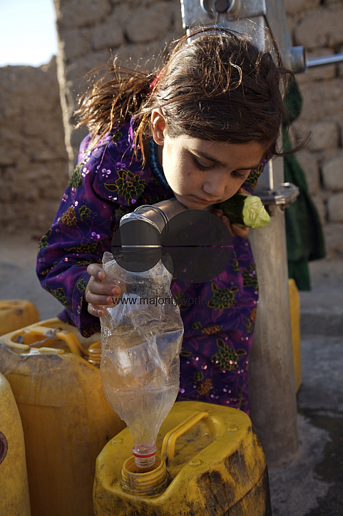 A child collects drinking water from a hand pump in Maslakh camp for internally displaced people, on the outskirts of the north-western city of Herat. The Maslakh camp is no longer officially in operation, but many people from remote provinces still seek shelter here, fleeing poverty and conflict in rural areas. Afghanistan. June 20, 2007.