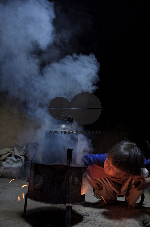 Using brush and wood, Aqila, 8, an ethnic Hazara, lights a fire in the kitchen stove, in her home in the village of Ragshad in the central Bamyan Province. Her father works as a daily laborer and the seven children of the family must work up to eight hour