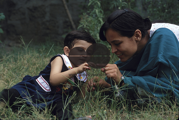 A woman helps a child to understand nature, by letting her experiment with a flower, at the garden of a school, in Gilgit, a major city of the northern region of Pakistan. May 18, 2005.