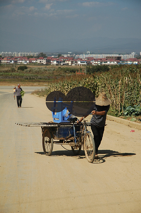 A middle-age man is pulling a cart back to his village in the suburbs of Jinghong after a full day of selling his goods in the city. The empty cart carries materialist values from the big city back to the village where the traditional lifestyle remains. D