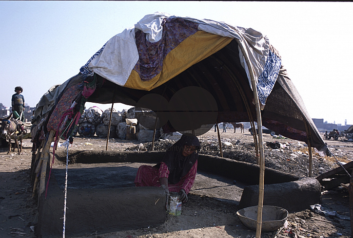 A woman from one of the nomadic tribes building a shack with mud and other cheap objects, at a village in Punjab province, in Pakistan. July 3, 2005.