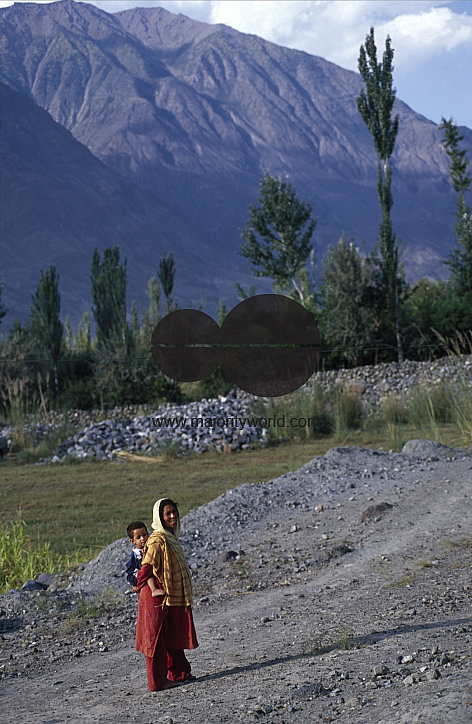 A woman carries her child on her back, near a village in Gilgit, in the foothills of Himalayan mountain range of Northern Areas of Pakistan. November 9, 2008.