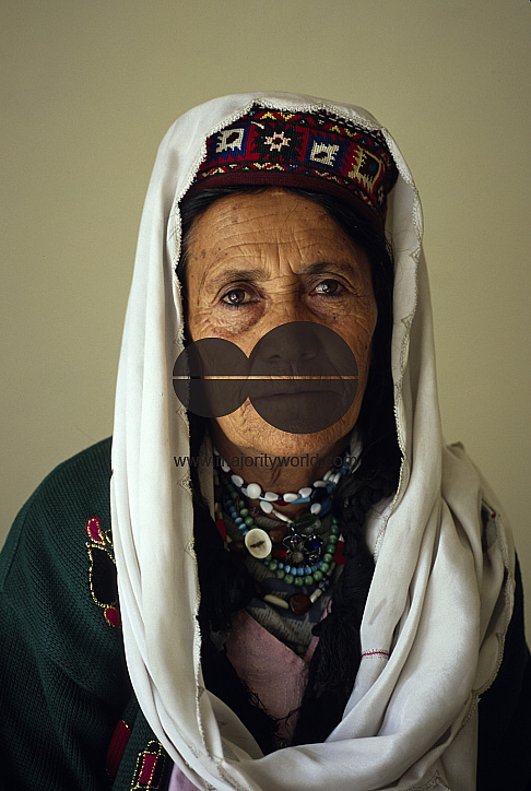 Portrait of a Hunzai woman, at Karimabad village, in Hunza Valley, on the foothills of the Himalayan mountain range, in Northern Pakistan. This village is mainly inhabited by Ismailis, a progressive group of Muslims who follow Prince Karim Aga Khan as their spiritual leader. Pakistan. November 9, 2005.