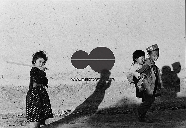 A young Pasthun boy carries his sibling over his back while his sister follows, at a village, in North West Frontier Province, NWFP, of Pakistan.