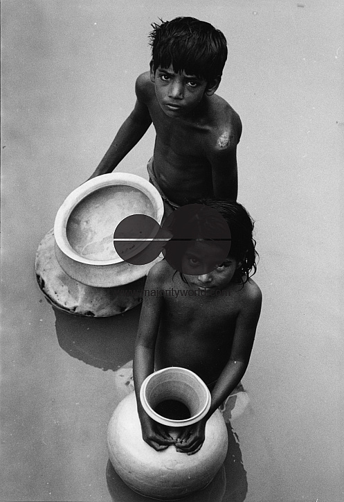A young boy and a girl carry empty pots, looking for drinking water, in the midst of one of the worst floods Bangladesh ever experienced in 1988, in Dhaka, the capital city of Bangladesh.