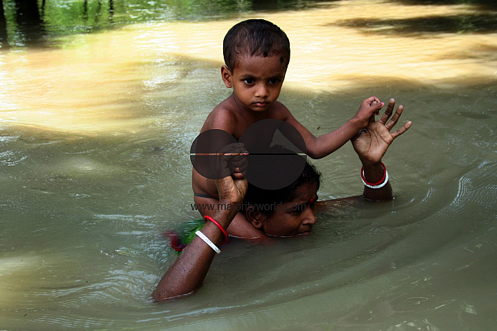 A woman wades through neck deep water, carrying her child, in search of high land, at a village near Manikganj district, in Bangladesh. Around 4.6 million people have been affected and 38 people have died in the flooding. August 2, 2007.