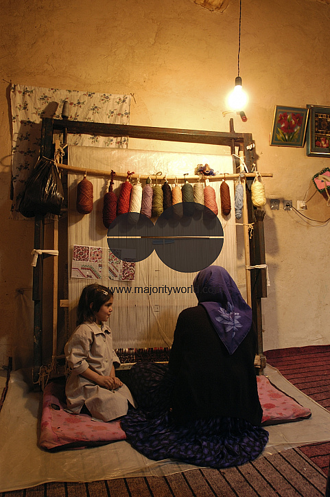 Fatima Momini, 31, weaves a 1.5 square meter carpet while, Shiwa Momini, her daughter, watches, in a Kurdish village, Ahmedabad, about 30 km away from Takab, a major city in Western Azerbaijan. Fatima only weaves carpet in free time and can get about $500 for 1.5 meter. Depending on how much time she spends weaving, 1.5 meter carpet can take almost 6 months to 1 year to finish. Iran. January 20, 2004.