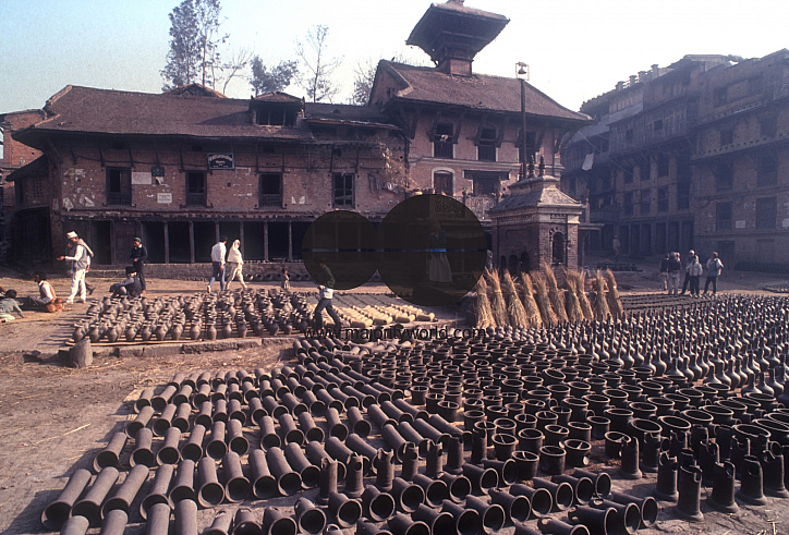 Nepal. A small square in the town laid out with pots drying in the sun. The town is well known for its pottery industry. All pots you see here have been thrown by hand. Kathmandu valley.