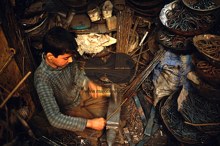 Dhiyaa Mohammed, 12, works in a blacksmith shop owned by his father in Baghdad, the capital. Dhiyaa says, "I studied up to grade five. But I didnt like school so my father put me to work here. This is worse than school, so I plan to return to school soon."