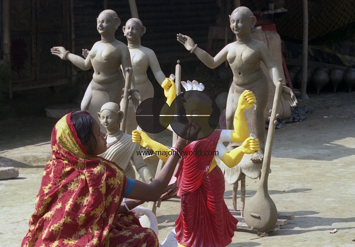 An artist gives the final touch on the idol of goddess Durga.Hindus believe that the goddess has the power to drive away all the evil spirits. Durga Puja is the biggest festival of this community.Gazipur, Dhaka, Bangladesh.