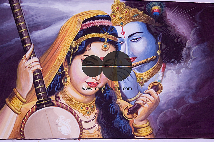 A vibrant painting on a rickshaw. In Bangladesh rickshaws, a common mode of transport, are painted in bright colors and decorated with paper conffeti to give them a visual appeal. Most often folk, religious and children's stories find the pride of place.