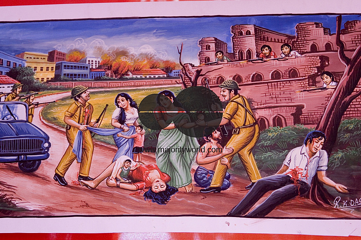 A vibrant painting on a rickshaw. In Bangladesh rickshaws, a common mode of transport, are painted in bright colors and decorated with paper conffeti to give them a visual appeal. Most often folk, religious and children's stories find the pride of place.