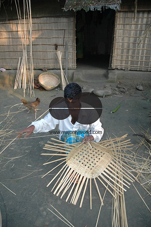 For the rest of the days he is a farmer. But every Sunday he goes to the market to buy bamboo sticks out of which he makes baskets to sell in the weekly market for an extra income. Kathiadi, Kishorganj.