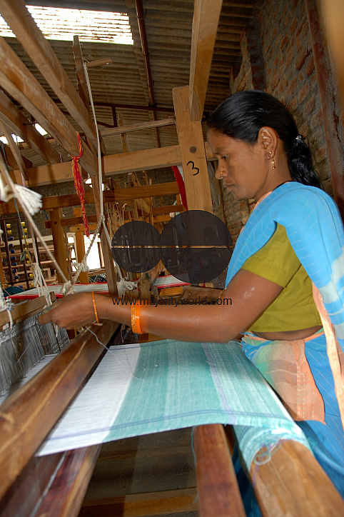 India: The NGO SIRDI organized women in self-help groups. Seen here the lady is weaving a cloth produced from the thread that is also grown in the nearby villages. This trust sells the cloth in the open markets and the revenue shared. 07-Mar-07. .