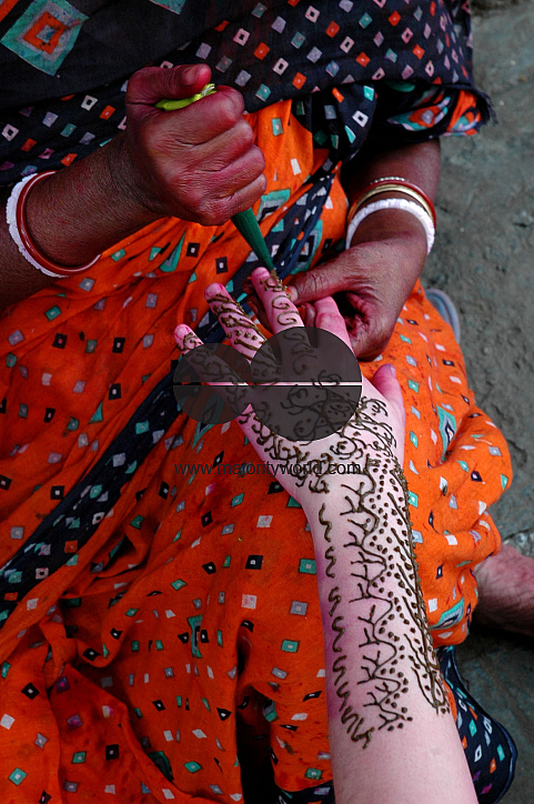 Making a beautiful Mehendi (henna) art on the hand of a foreign woman at Kolkata’s Free School Street during the festival of holi. Every year many foreigners come from all over the world to participate in this colorful festival. India, March 3, 2007.