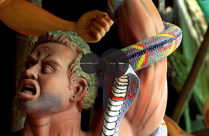 Clay idols under process in a workshop at Kumartuli, West Bengal, India. Kumartuli, the nerve centre of the clay idol-makers of West Bengal, is home and workshop to more than one hundred and fifty families of clay model-makers. Nearly eighty per cent of the community puja images in Calcutta are made at Kumartuli by artisans, who strive to make something new and innovative in their sphere of endeavour.