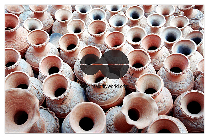 Earthen flower vases kept under the sun for drying. This type of flower vases is usually seen at the fairs. Chittagong, Bangladesh. April 25, 2007.