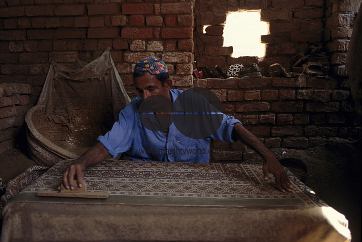 An artisan making block prints over a piece of cloth, locally known as ajrak, worn by both men and women through out Sindh province, in Pakistan. April 20, 2005.