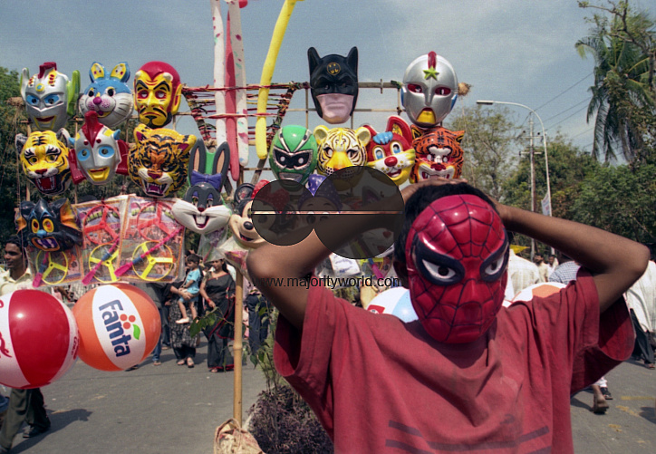 A street-side toy store. The seller who is a teen, wearing a mask himself to draw attention of children on the occasion of International Mother Language Day. February 21. Dhaka. Bangladesh.