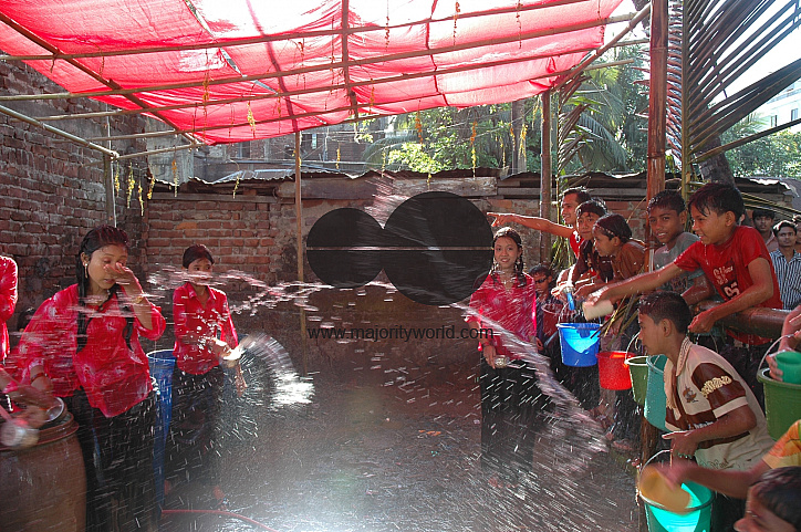 Young Rakhain Women and Men throw water to opposition to express their love at Cox's Bazar in Bangladesh. At the end of the play the girl came to near the men and express their emotion..